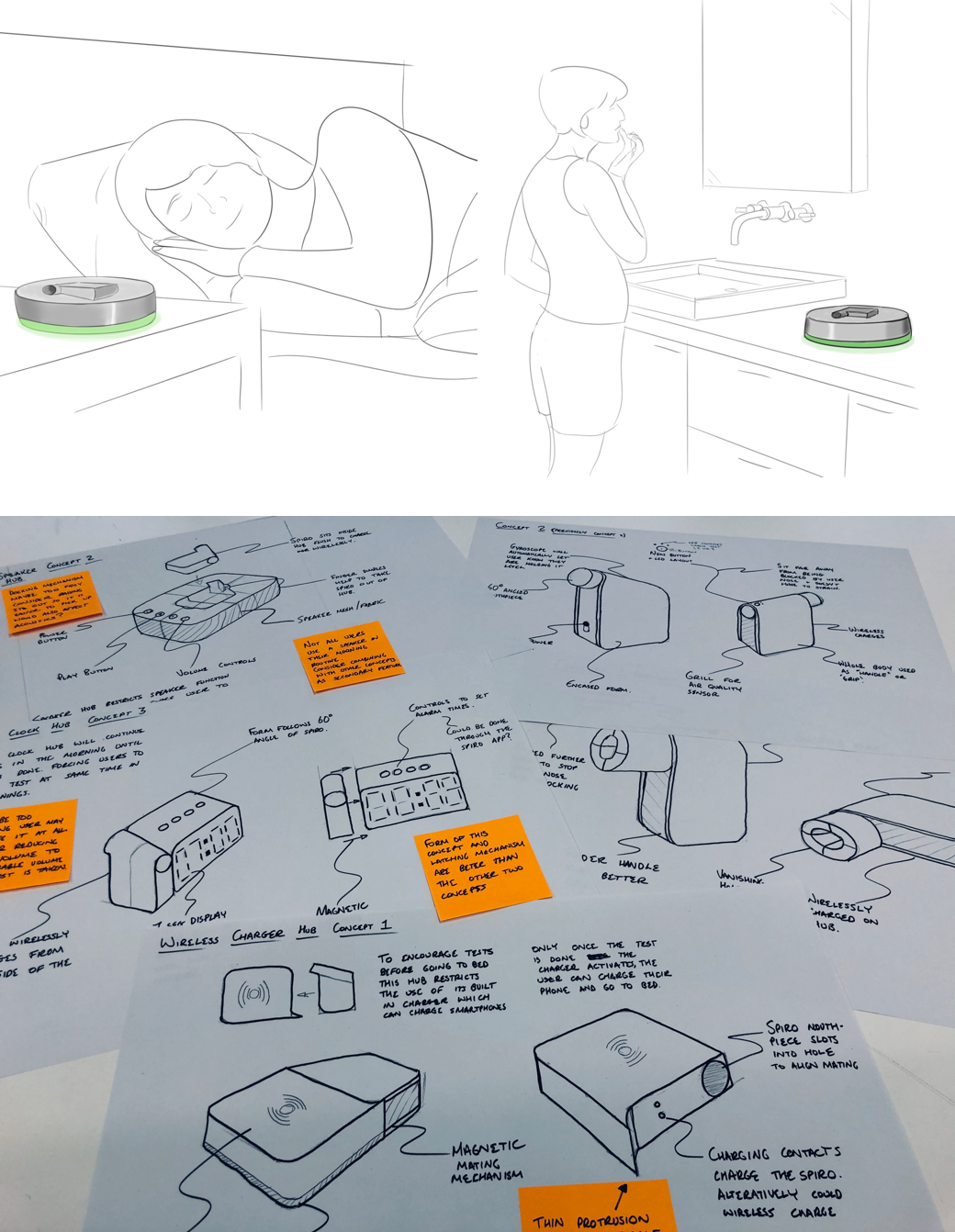 Using a self critiquing method to explore the ergonomics of the device I (50th percentile) was able to test how comfortable the device was to take a spirometry test and use alongside the charging hub. The spirometer was easy to hold in the hand and the angled shaped helped to maintain a good posture during testing. The charging hub was easy to use for a smartphone however charging the spirometer was required a bit more dexterity due to the small gap it sits inside of the hub.