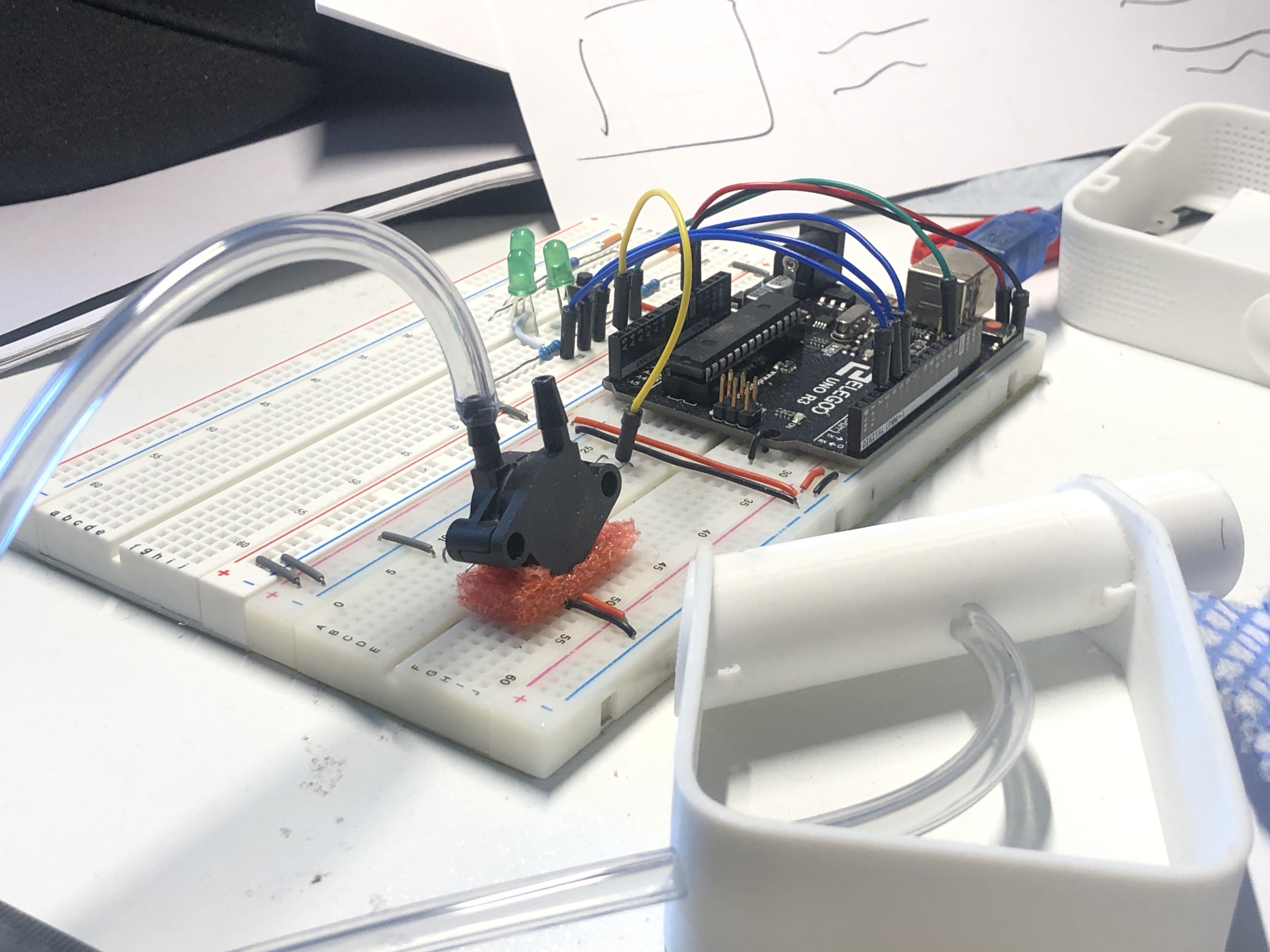 The electronic prototype was an all round success; guiding me through the process of taking a spirometry test including repeating the test 3 times for accuracy. The whole test process took around 4 minutes to complete and receive the results. This testing process also allowed for the assessment of the mouthpiece for a 50th percentile user. The addition of LEDs to help the user understand the status of the device and the test was a nice feature. The air quality sensor was also tested separately subjecting it to standard household pollutants such as stove tops, aerosols and candles. The next step would be to try and implement the system into the body of the spirometer to gain realism of the final use case.
