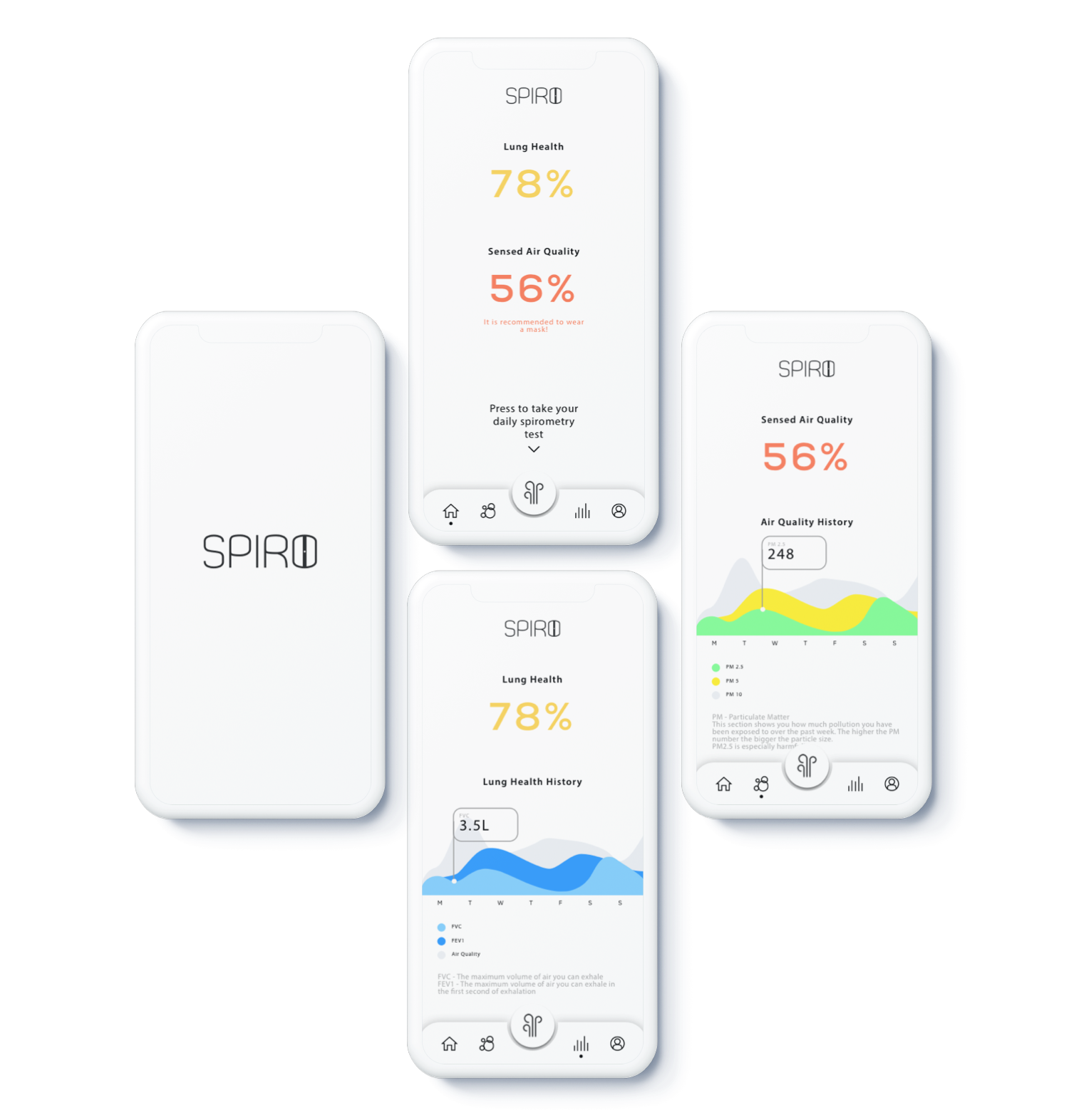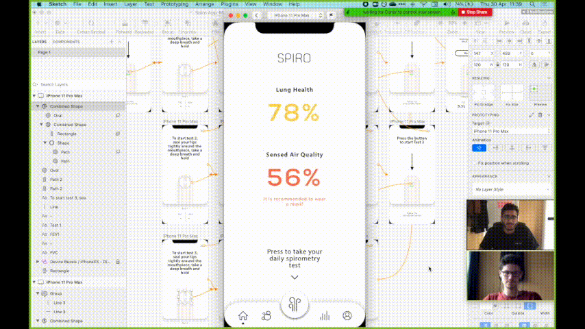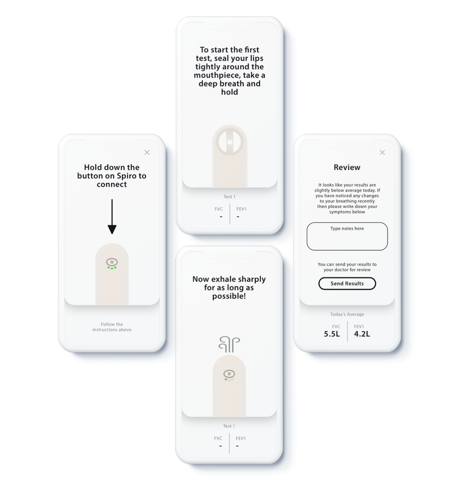 The interactive app prototype was tested by multiple users over zoom meeting which allowed them to remotely control the app through screen sharing. There were many useful takeaways from the testing of this prototype including adding an onboarding process explaining the different features of the app, adjustmenting how data was displayed and the addition of animations during the spirometry test guide instead of static images.